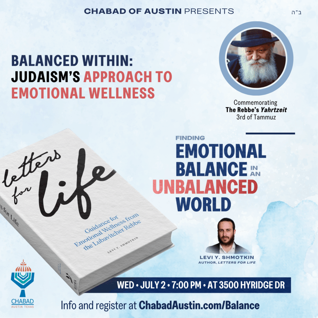 Join us for Balanced Within: Judaism’s Approach to Emotional Wellness, based on the teachings of the Lubavitcher Rebbe. Featuring guest speaker Levi Shmotkin, author of Letters for Life. This event marks the Rebbe’s histalkus hillula on the third of Tammuz.