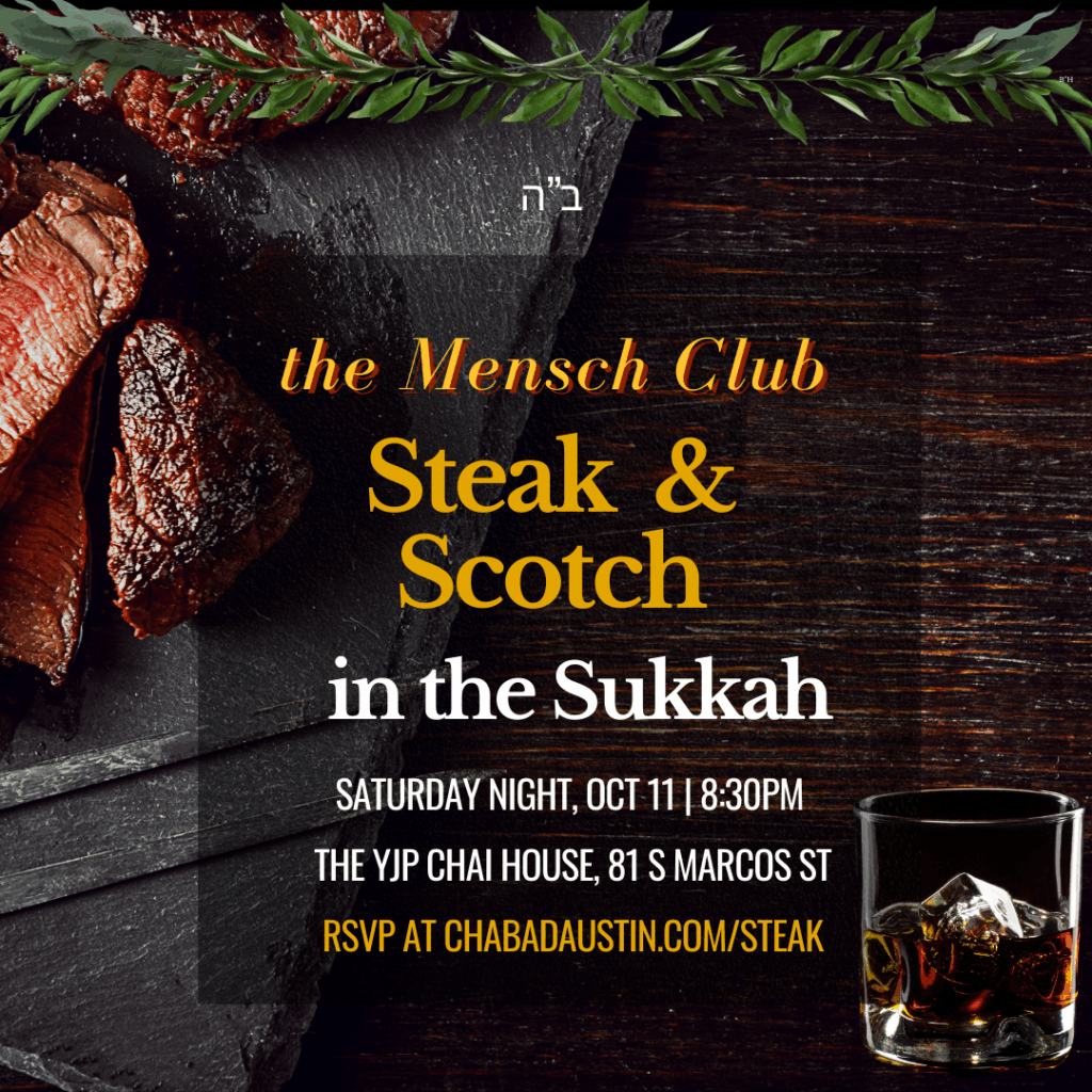 Enjoy Steak, scotch, and the camaraderie of friends in the embrace of the Sukkah!