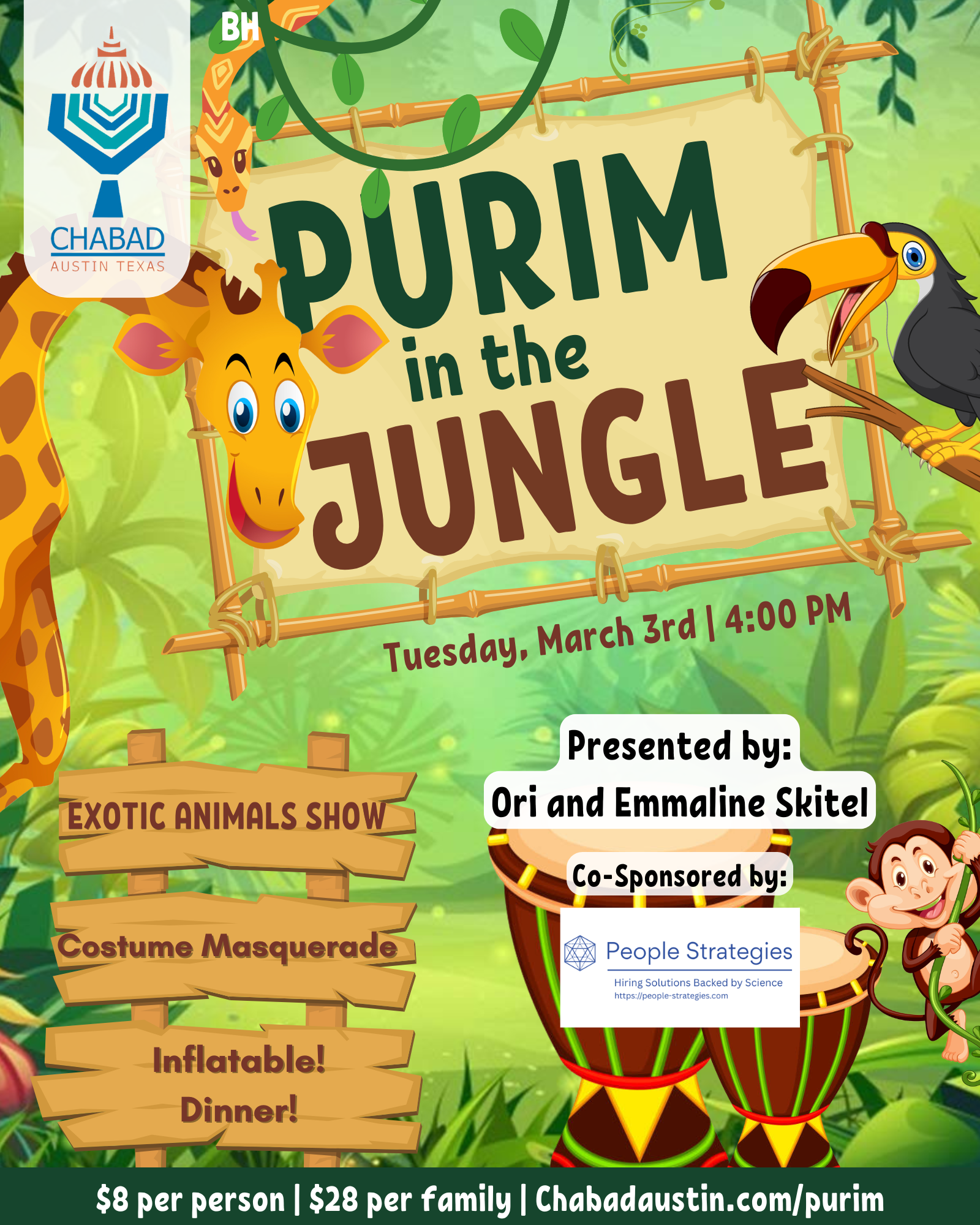 Join us for Purim in the Jungle presented by Ori & Emmaline Skitel, and co-sponsored by People Strategies! Featuring: Light Jungle Dinner Exotic Animal Show Epic Bounce House Costume Masquerade with prizes! Megillah Readings