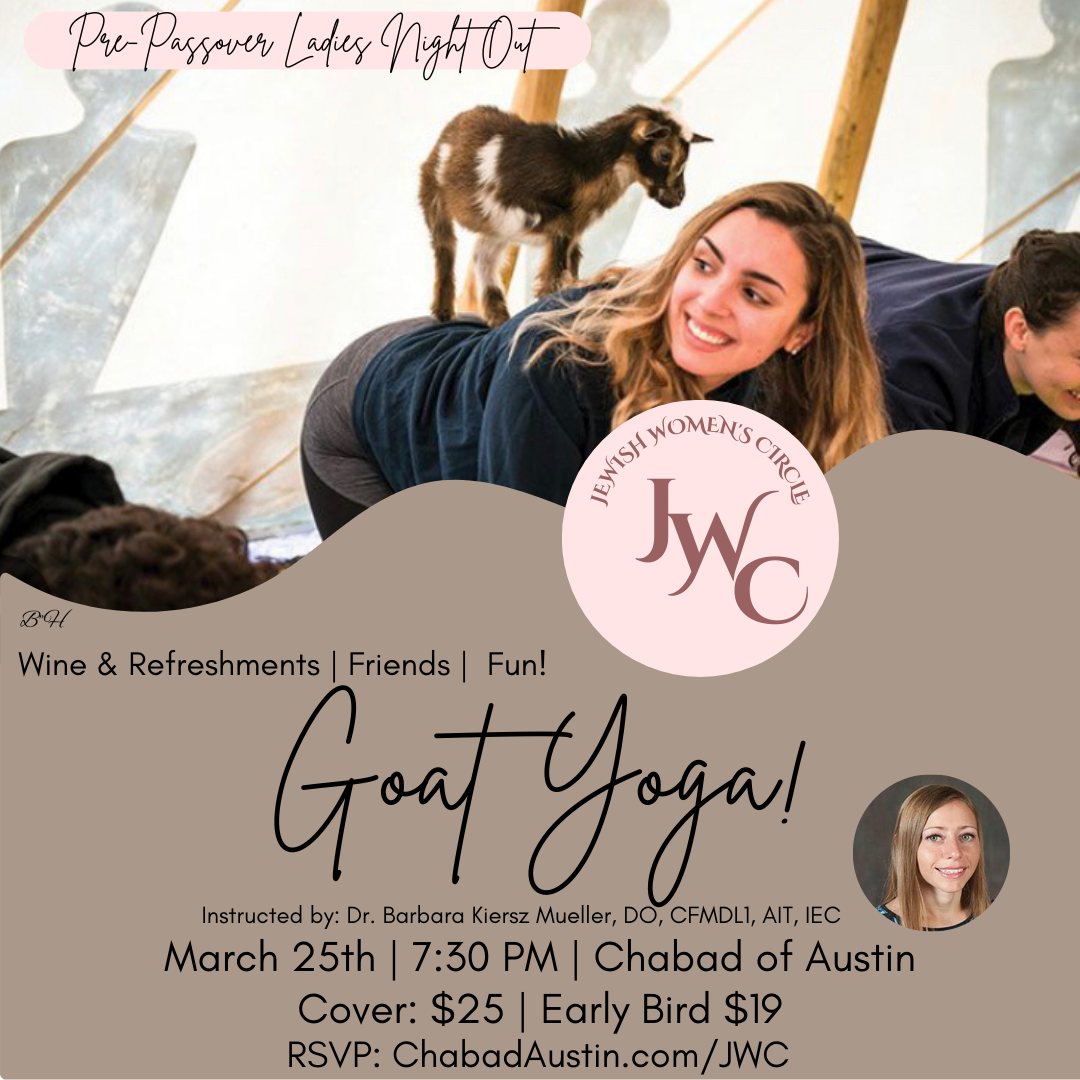 Chabad of Austin 3500 Hyridge Drive, AustinJoin fellow women for a unique and uplifting experience with goat yoga! Let go of stress, get inspired, and connect with your feminine power! Relax during this busy time of […]
