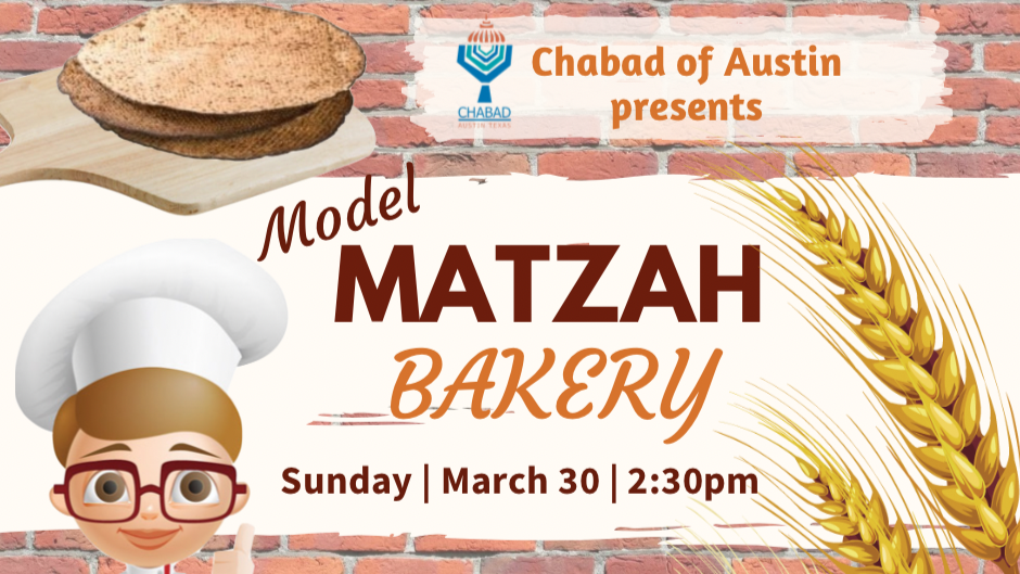 Chabad of Austin 3500 Hyridge Drive, AustinJoin us for an epic, exciting, interactive Model Matza Bakery! Do you know how Matzah is made? What ingredients go inside? Here is your chance to ROLL, KNEAD, and CREATE […]